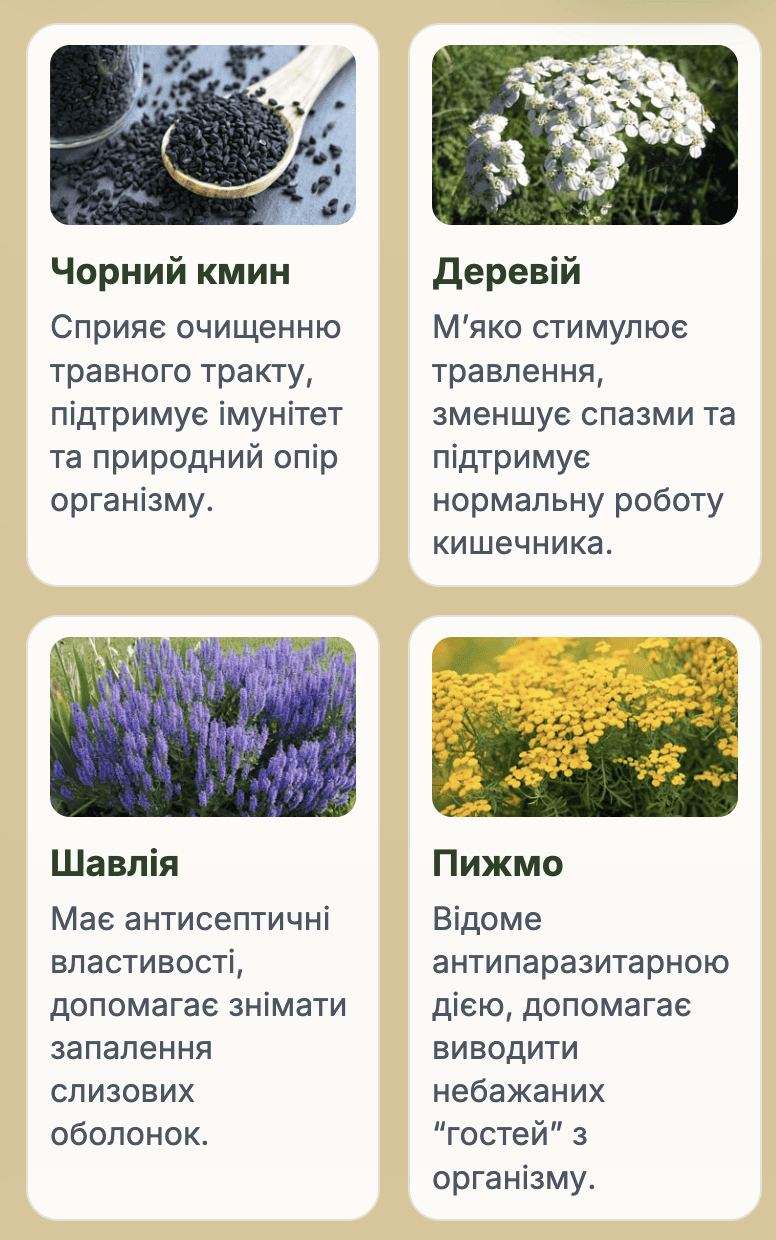 У формулу входять компоненти, відомі своїми антипаразитарними, протизапальними та детокс-властивостями.
